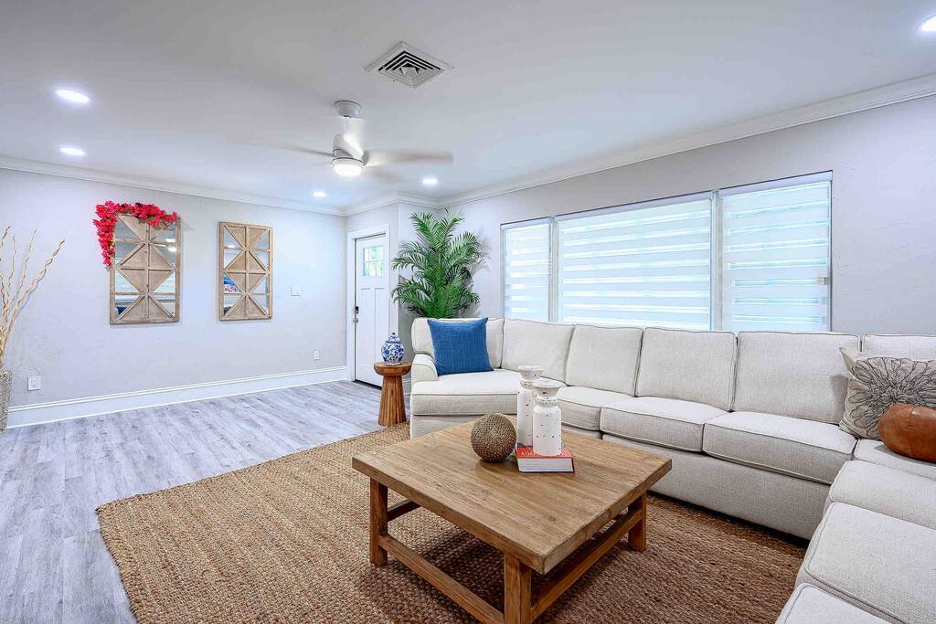 🏠 The Space This home is designed for comfort, style, and unforgettable memories. The open layout flows effortlessly from the living room to the kitchen and dining areas, all bathed in natural light. What You’ll Love: 3 stylish bedrooms w/ premium linens & Smart TVs Spacious open-plan living area w/ chic furniture Fully equipped kitchen with quartz countertops & modern appliances Indoor dining for 6 + island seating for 4 Backyard oasis w/ pool & fire pit Washer/dryer, high-speed Wi-Fi, central A/C