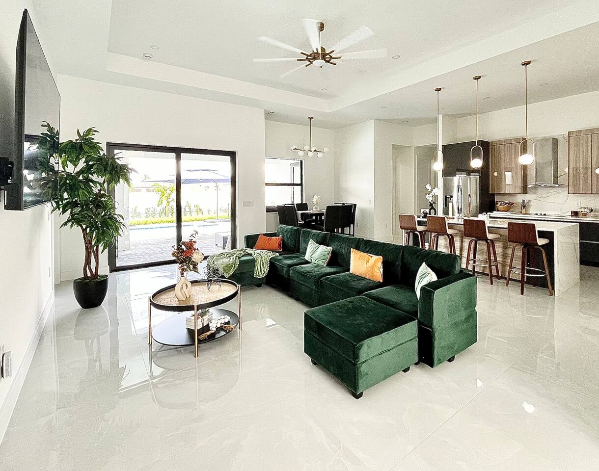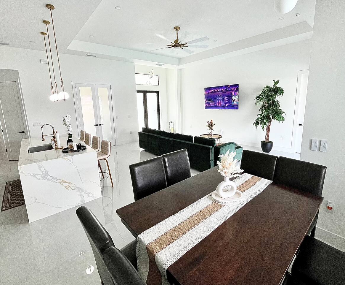 Find your peaceful retreat right here in beautiful Cape Coral, this lovely Oasis features all modern brand new amenities including gorgeous back patio with outdoor kitchen, dining, pool, fenced yard. Sun and sip on a cool drink. Relax and watch movies at the end of the evening in our comfortable large open living room. Cook a gourmet meal in the chefs kitchen. Rest in a comfortable and peaceful nights sleep on the luxury king bed, spacious room for the entire family sleeps over 9 people.