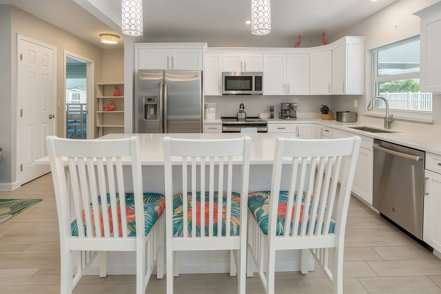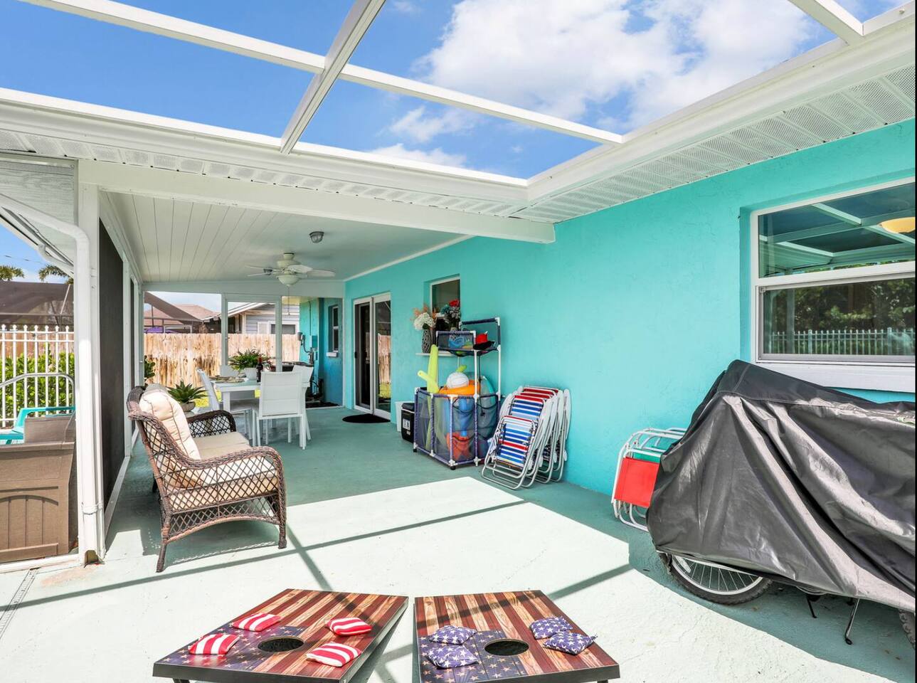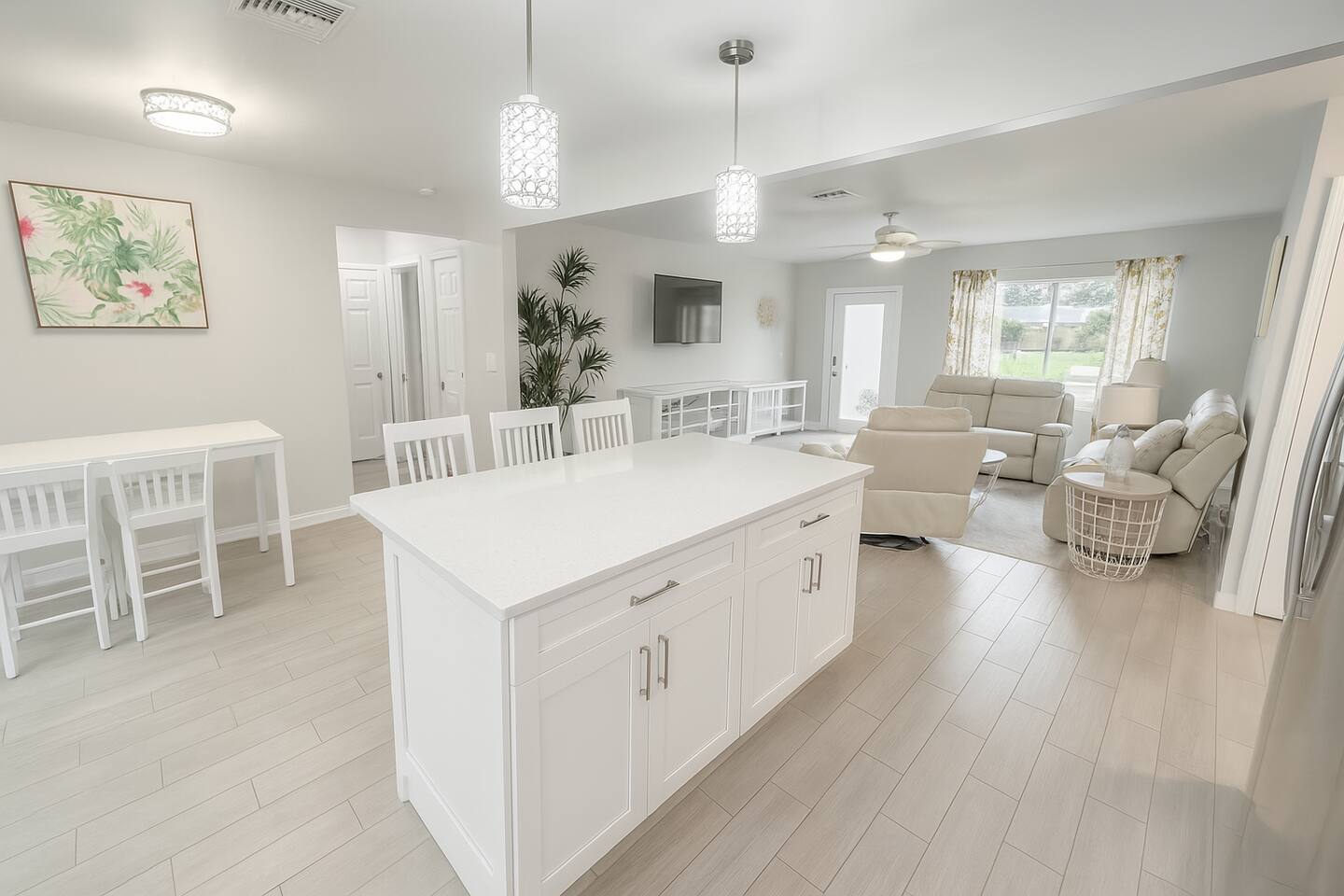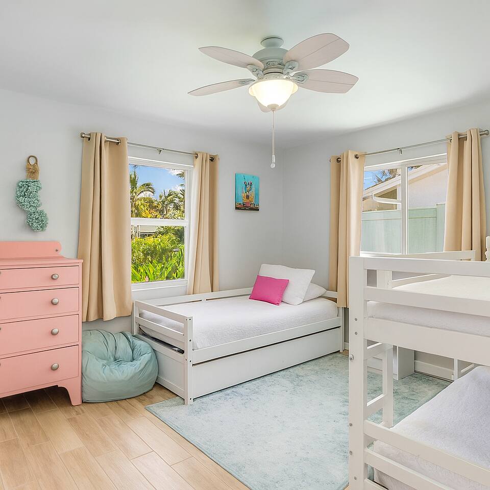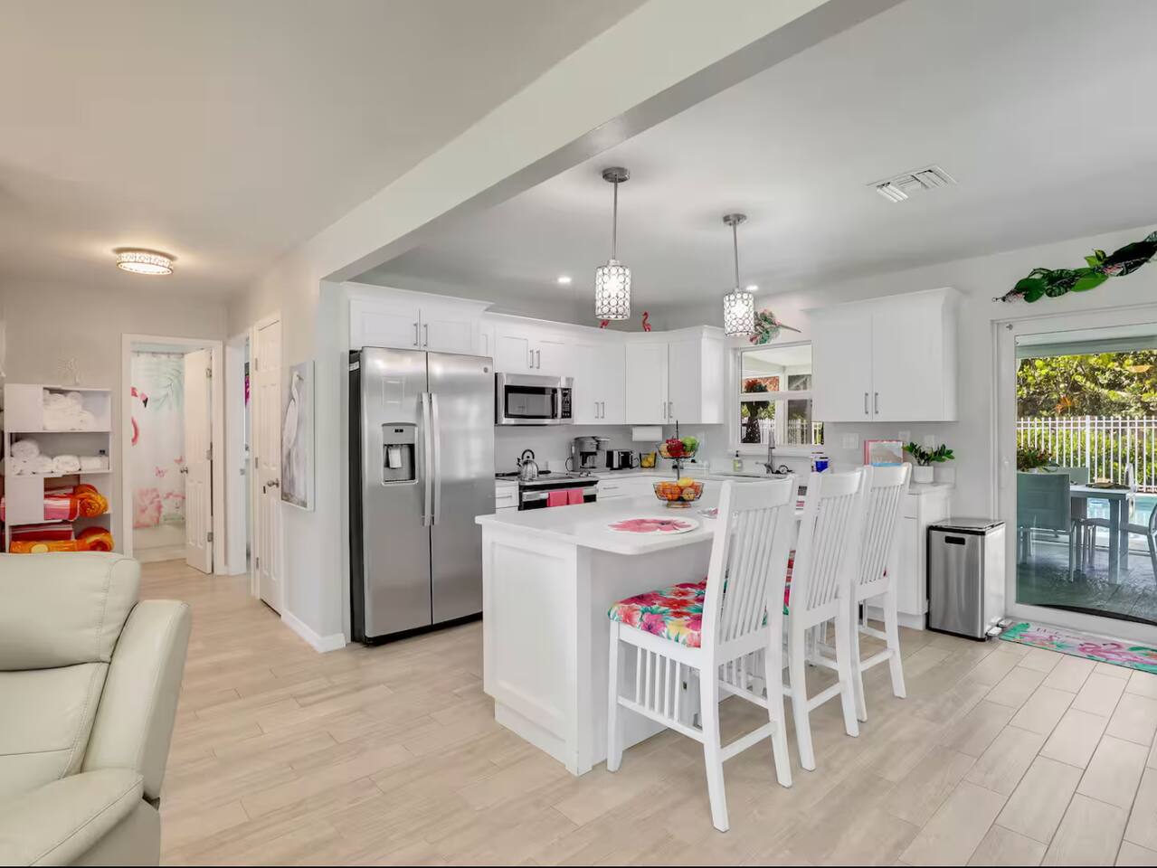 ✔ 3 Comfortable Bedrooms (Sleeps 8) ✔ Open Design Living ✔ Fully Equipped Kitchen ✔ Backyard (Pool, BBQ, Dining, Lounge, Lawn) ✔ Smart TVs ✔ High-Speed Wi-Fi ✔ Bicycles ✔ Laundry ✔ Free Parking The space Step into this tropical beach-inspired retreat, where your tour begins in the open-concept living area. The vibrant, coastal-themed living room seamlessly flows into a fully equipped kitchen and a cozy dining space—perfect for gathering after a day at the beach. Sunlight pours through large windows, illuminating the tasteful decor and creating a bright, welcoming atmosphere designed for relaxation. But the real magic begins when you slide open the doors to the screened lanai. Enjoy a cool drink in the shade, then head out to the backyard—an oasis made for unforgettable moments. Fire up the grill, dine al fresco under the palms, or take a dip in your private swimming pool while the rest of the family lounges and soaks in the sun. When it’s time to unwind, retreat to one of three beautifully appointed bedrooms, each designed with comfort and tranquility in mind. While it may not be your bed at home, we think you’ll find these come pretty close. ★ LIVING ROOM ★ Kick back and relax in the bright, beachy living room—perfect for movie nights or a fun board game session with loved ones. The inviting space features two plush sofas, a cozy accent chair, and a Smart TV for all your streaming needs. ✔ Two Comfortable Sofas with Pillows ✔ Smart TV with Streaming Options ✔ Selection of Board Games ✔ Accent Chair for Reading or Lounging ✔ Coffee Tables & Reading Lamps ★ KITCHEN & DINING ★ Cook up your favorite meals in the vibrant, fully stocked kitchen featuring premium appliances and ample counter space. Whether you’re whipping up a quick breakfast or a family feast, this kitchen has everything you need. ✔ Modern Appliances (Microwave, Stove, Oven, Toaster, Blender) ✔ Keurig Coffee Maker & Hot Water Kettle ✔ Double-Door Refrigerator/Freezer ✔ Dishwasher & Deep Sink (Hot/Cold Water) ✔ Full Set of Cookware, Dishes, Glassware & Utensils Adjacent to the kitchen, the dining area is perfectly placed to keep the conversation flowing from kitchen to living room. Enjoy meals together at the stylish dining table or grab a quick bite at the breakfast bar. ✔ Dining Table for 4 ✔ Breakfast Bar Seating for 3 ✔ Easy Access to the Backyard ★ SLEEPING ARRANGEMENTS – 3 BEDROOMS ★ After a day of adventure, retreat to one of three serene bedrooms, each thoughtfully designed for rest and relaxation. ♛ Master Suite – King Bed, Private Work Area, Reading Nook, Ensuite Bathroom, Backyard Access ♛ Bedroom 2 – Queen Bed, Bright and Peaceful Vibe ♛ Bedroom 3 – Twin Bunk Bed + Full Bed with Trundle pull out bed, Great for Kids or Extra Guests ✔ Premium Linens, Pillows & Comforters ✔ Smart TVs in Each Room ✔ Spacious Dressers & Closets with Hangers ✔ Bedside Tables with Reading Lamps ★ BATHROOMS ★ Enjoy the spa-like feel of two beautifully designed bathrooms, fully stocked with essentials and extra touches for your convenience. ✔ Walk-In Shower (Primary Bath) ✔ Bathtub with Shower Combo ✔ Modern Vanities & Large Mirrors ✔ Fresh Towels, Hair Dryer & Toiletries ★ SCREENED LANAI & BACKYARD OASIS ★ Step into your private tropical retreat, where relaxation meets fun. The screened lanai offers shaded comfort, while the sparkling pool invites hours of sun-soaked enjoyment. Grill out, dine al fresco, or simply unwind with a view of the lush lawn. ✔ Private Swimming Pool with Floaties ✔ Outdoor Dining Table (Seats 6) ✔ Comfortable Lounge Seating ✔ Gas BBQ Grill ✔ Large Fenced Lawn – Perfect for Kids ✔ High-Speed Wi-Fi ✔ Self Check-In with Smart Lock ✔ Central Air Conditioning & Heating ✔ In-Home Laundry (Washer, Dryer, Iron & Board) ✔ Beach Gear (Chairs, Cart, Cooler, Parasol, Floaties) ✔ Bicycles for Exploring ✔ Free Parking on Premises ★ FAMILY-FRIENDLY EXTRAS ★ We’ve got the little ones covered too! ✔ Travel Crib ✔ High Chair