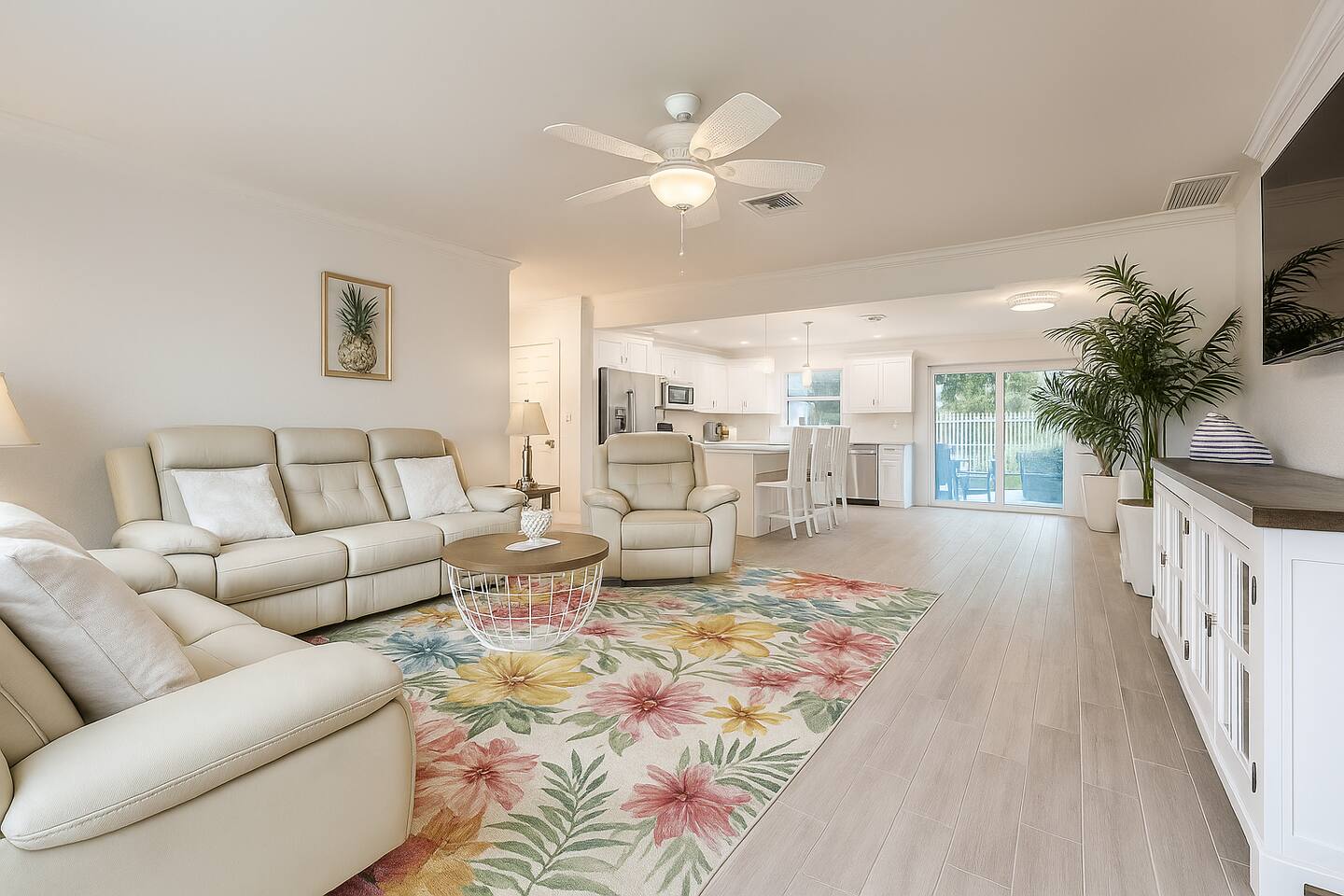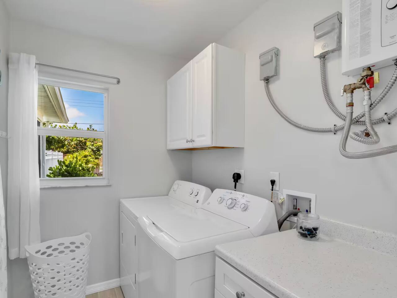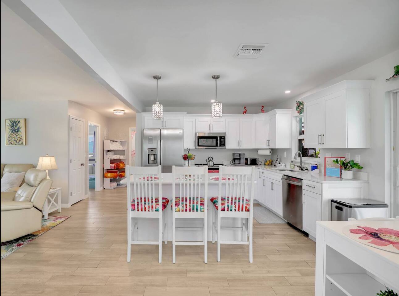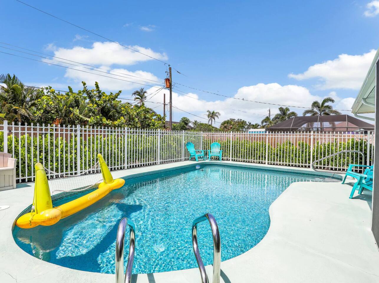 ✔ 3 Comfortable Bedrooms (Sleeps 8) ✔ Open Design Living ✔ Fully Equipped Kitchen ✔ Backyard (Pool, BBQ, Dining, Lounge, Lawn) ✔ Smart TVs ✔ High-Speed Wi-Fi ✔ Bicycles ✔ Laundry ✔ Free Parking The space Step into this tropical beach-inspired retreat, where your tour begins in the open-concept living area. The vibrant, coastal-themed living room seamlessly flows into a fully equipped kitchen and a cozy dining space—perfect for gathering after a day at the beach. Sunlight pours through large windows, illuminating the tasteful decor and creating a bright, welcoming atmosphere designed for relaxation. But the real magic begins when you slide open the doors to the screened lanai. Enjoy a cool drink in the shade, then head out to the backyard—an oasis made for unforgettable moments. Fire up the grill, dine al fresco under the palms, or take a dip in your private swimming pool while the rest of the family lounges and soaks in the sun. When it’s time to unwind, retreat to one of three beautifully appointed bedrooms, each designed with comfort and tranquility in mind. While it may not be your bed at home, we think you’ll find these come pretty close. ★ LIVING ROOM ★ Kick back and relax in the bright, beachy living room—perfect for movie nights or a fun board game session with loved ones. The inviting space features two plush sofas, a cozy accent chair, and a Smart TV for all your streaming needs. ✔ Two Comfortable Sofas with Pillows ✔ Smart TV with Streaming Options ✔ Selection of Board Games ✔ Accent Chair for Reading or Lounging ✔ Coffee Tables & Reading Lamps ★ KITCHEN & DINING ★ Cook up your favorite meals in the vibrant, fully stocked kitchen featuring premium appliances and ample counter space. Whether you’re whipping up a quick breakfast or a family feast, this kitchen has everything you need. ✔ Modern Appliances (Microwave, Stove, Oven, Toaster, Blender) ✔ Keurig Coffee Maker & Hot Water Kettle ✔ Double-Door Refrigerator/Freezer ✔ Dishwasher & Deep Sink (Hot/Cold Water) ✔ Full Set of Cookware, Dishes, Glassware & Utensils Adjacent to the kitchen, the dining area is perfectly placed to keep the conversation flowing from kitchen to living room. Enjoy meals together at the stylish dining table or grab a quick bite at the breakfast bar. ✔ Dining Table for 4 ✔ Breakfast Bar Seating for 3 ✔ Easy Access to the Backyard ★ SLEEPING ARRANGEMENTS – 3 BEDROOMS ★ After a day of adventure, retreat to one of three serene bedrooms, each thoughtfully designed for rest and relaxation. ♛ Master Suite – King Bed, Private Work Area, Reading Nook, Ensuite Bathroom, Backyard Access ♛ Bedroom 2 – Queen Bed, Bright and Peaceful Vibe ♛ Bedroom 3 – Twin Bunk Bed + Full Bed with Trundle pull out bed, Great for Kids or Extra Guests ✔ Premium Linens, Pillows & Comforters ✔ Smart TVs in Each Room ✔ Spacious Dressers & Closets with Hangers ✔ Bedside Tables with Reading Lamps ★ BATHROOMS ★ Enjoy the spa-like feel of two beautifully designed bathrooms, fully stocked with essentials and extra touches for your convenience. ✔ Walk-In Shower (Primary Bath) ✔ Bathtub with Shower Combo ✔ Modern Vanities & Large Mirrors ✔ Fresh Towels, Hair Dryer & Toiletries ★ SCREENED LANAI & BACKYARD OASIS ★ Step into your private tropical retreat, where relaxation meets fun. The screened lanai offers shaded comfort, while the sparkling pool invites hours of sun-soaked enjoyment. Grill out, dine al fresco, or simply unwind with a view of the lush lawn. ✔ Private Swimming Pool with Floaties ✔ Outdoor Dining Table (Seats 6) ✔ Comfortable Lounge Seating ✔ Gas BBQ Grill ✔ Large Fenced Lawn – Perfect for Kids ✔ High-Speed Wi-Fi ✔ Self Check-In with Smart Lock ✔ Central Air Conditioning & Heating ✔ In-Home Laundry (Washer, Dryer, Iron & Board) ✔ Beach Gear (Chairs, Cart, Cooler, Parasol, Floaties) ✔ Bicycles for Exploring ✔ Free Parking on Premises ★ FAMILY-FRIENDLY EXTRAS ★ We’ve got the little ones covered too! ✔ Travel Crib ✔ High Chair